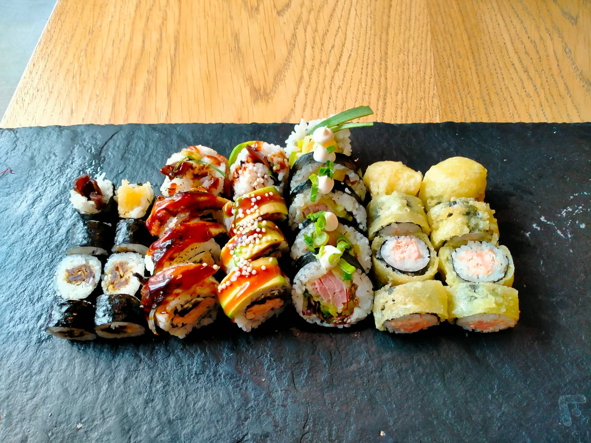 8x hosomak z tykwą w tempurze, 8x hosomak z awokado, 6x łosoś w tempurze, 8x węgorz w tempurze owinięty awokado -
